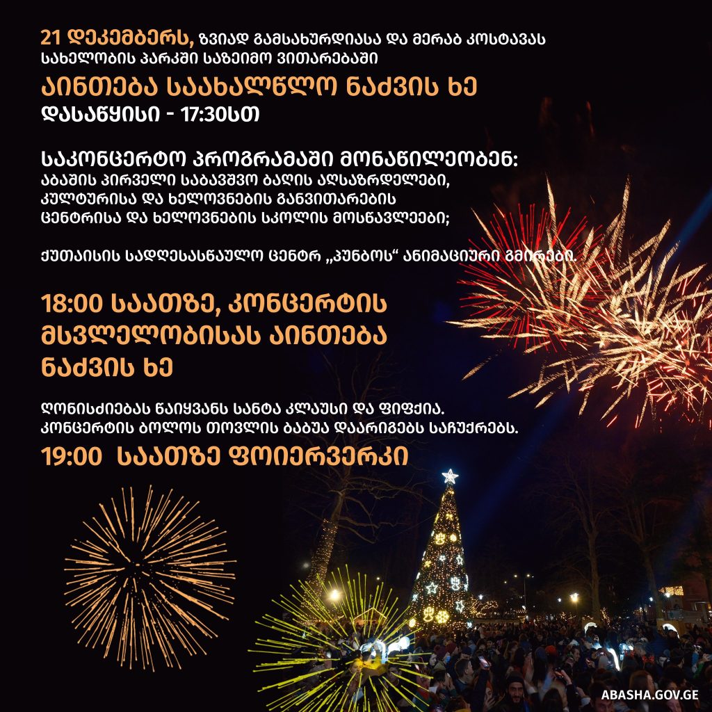 21 დეკემბერს, ზვიად გამსახურდიასა და მერაბ კოსტავას სახელობის პარკში საზეიმო ვითარებაში აინთება საახალწლო ნაძვის ხე.