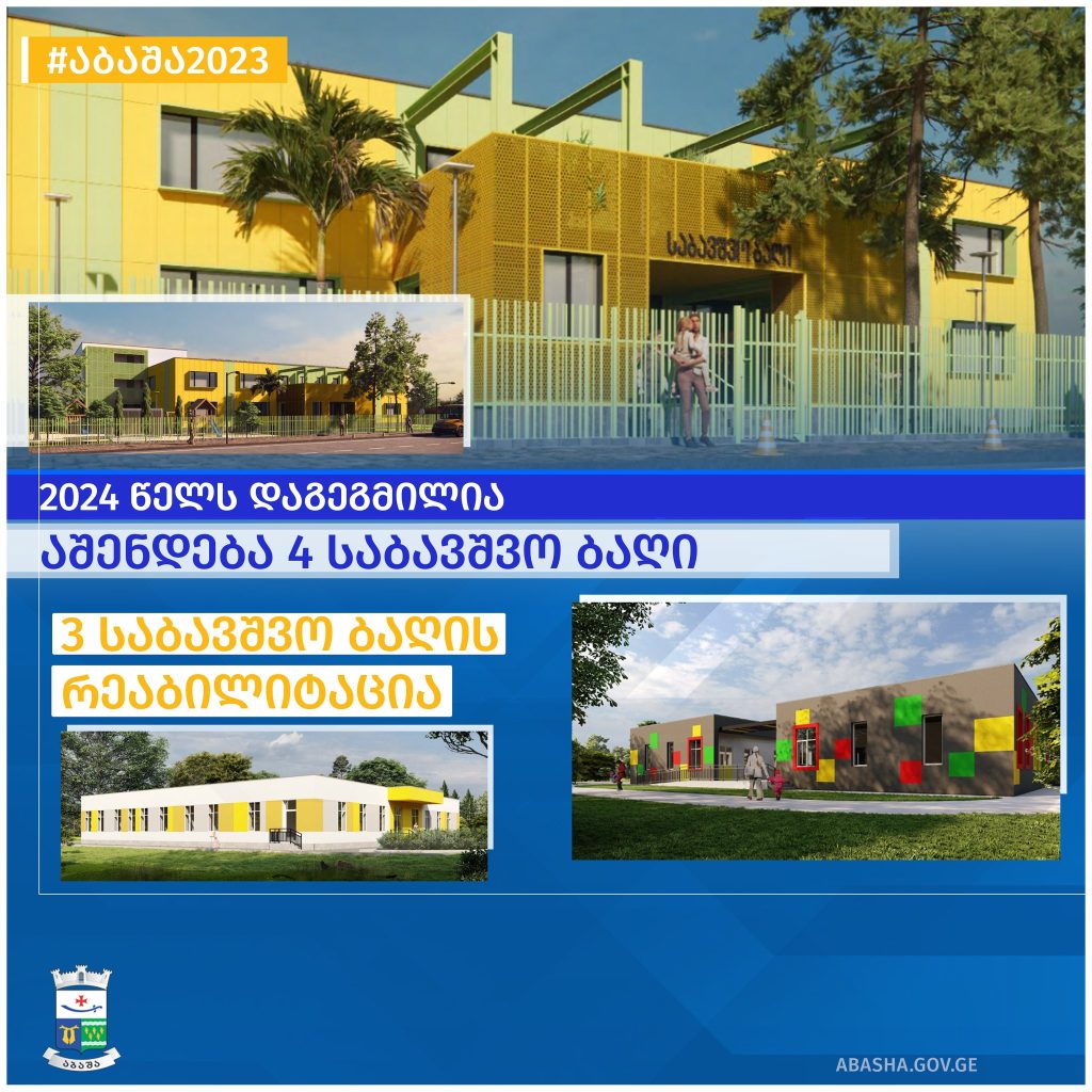 2024 წელს, საქართველოს პრემიერ-მინისტრის ინიციატივის ფარგლებში, აბაშის მუნიციპალიტეტში საბავშვო ბაღების მშენებლობა-რეაბილიტაციის პროგრამის განხორციელება დაიწყება.