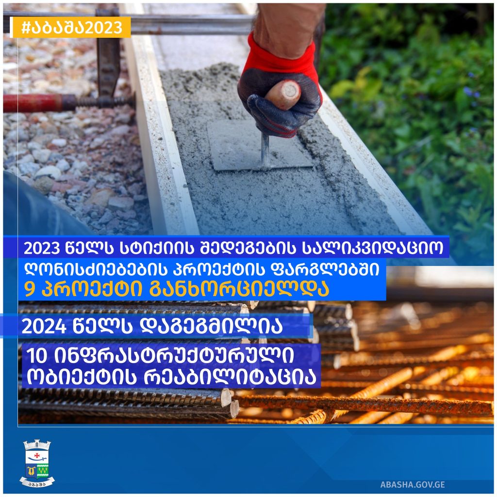 აბაშის მუნიციპალიტეტში, საქართველოს მთავრობის N2467 განკარგულებით, სტიქიის შედეგების სალიკვიდაციო ღონისძიებების პროექტის ფარგლებში, 9 პროექტი განხორციელდა. ინფრასტრუქტურული სამუშაოებისთვის 810 000 ლარი დაიხარჯა.
